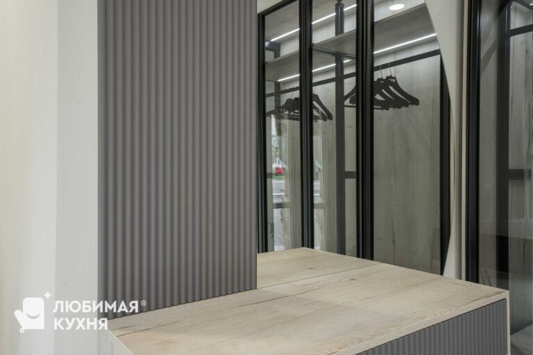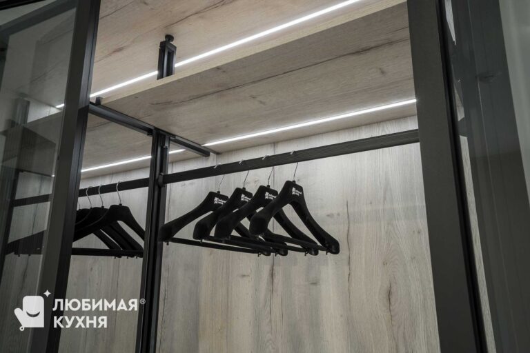 Комплект мебели в прихожую — подвесная тумба с зеркалом, стеновыми панелями и воздушным шкафом. Шкаф продуман для размещения верхней одежды на плечиках, а так же оборудован выдвижными ящиками. Подсветка обеспечивает отличный обзор всего содержимого, в таком шкафу вы не потеряете ни одну вещицу!